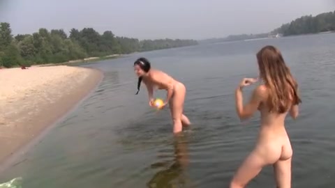Молоденькие сучки разделись до гола на пляже и играют в воде в мячик.