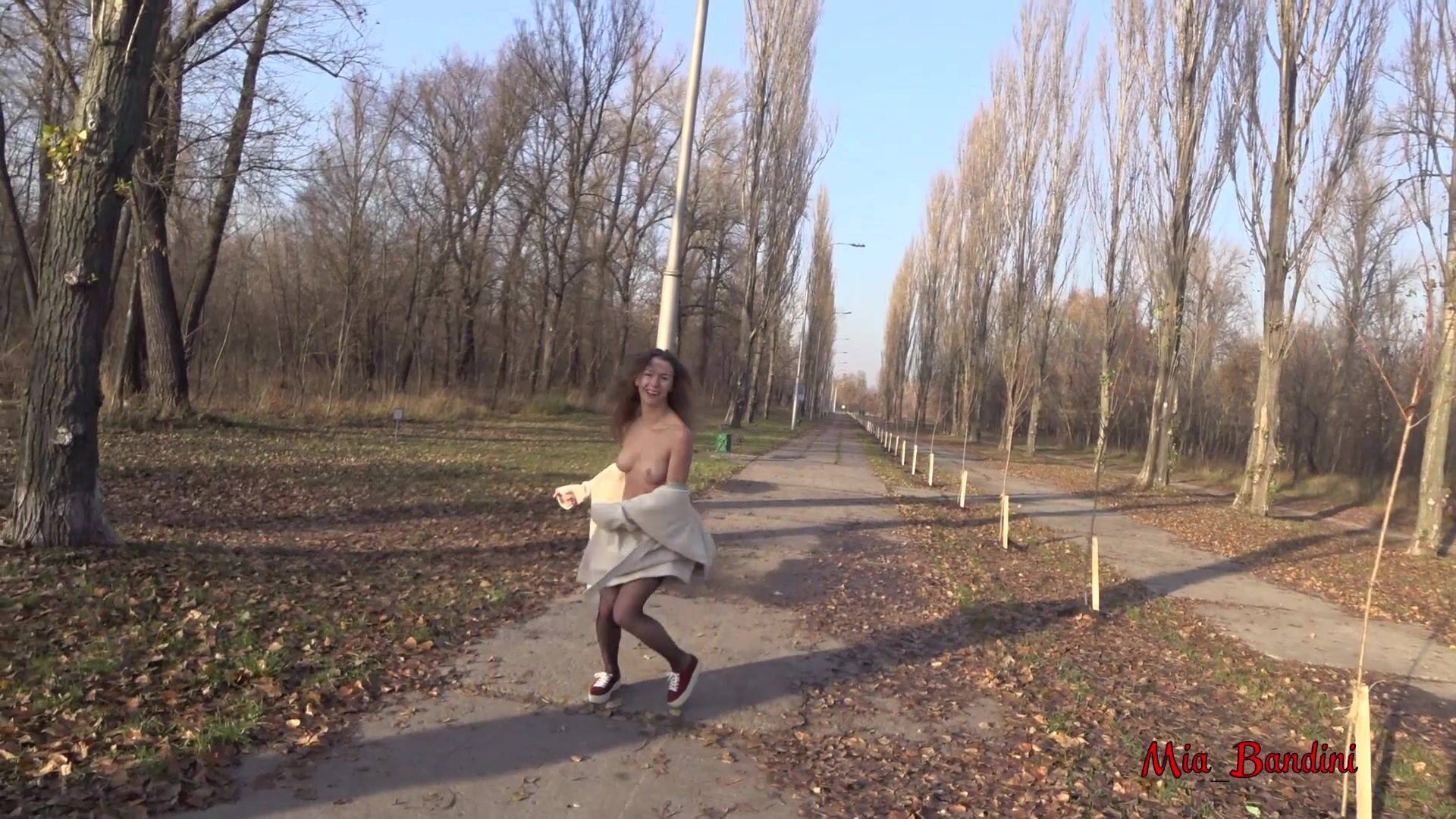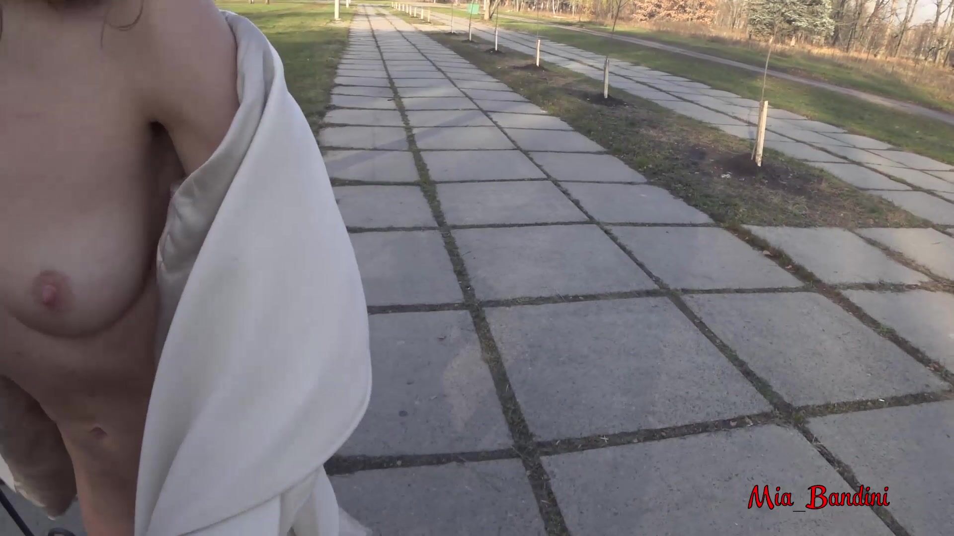 Миа Бандини решила развеяться на свежем воздухе в городском парке вместе со своим парнем. Во дворе стояла осень, все деревья уже сбросили листья, похолодало, но между ног красотки все так же горячо и она сделала приятный сюрприз бойфренду одев легкое пальто просто на голое тело. Гуляй душа, веселись пока молодая! Милашка танцует с расстегнутыми пуговицами, а из под пальтишка торчат упругие красивые сиськи. Веселая сучка становится раком и показывает домашнему оператору свою попу, после чего принимается сосать его член... Еще один погожий денек удался на славу!