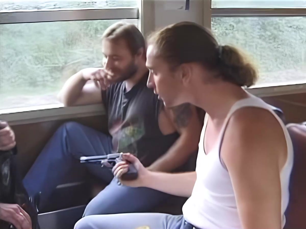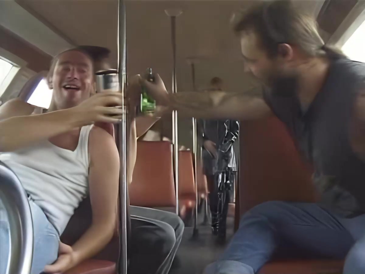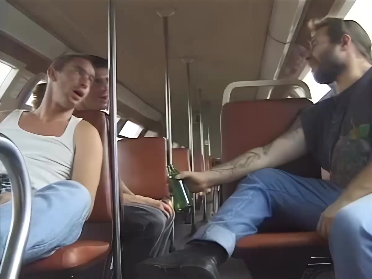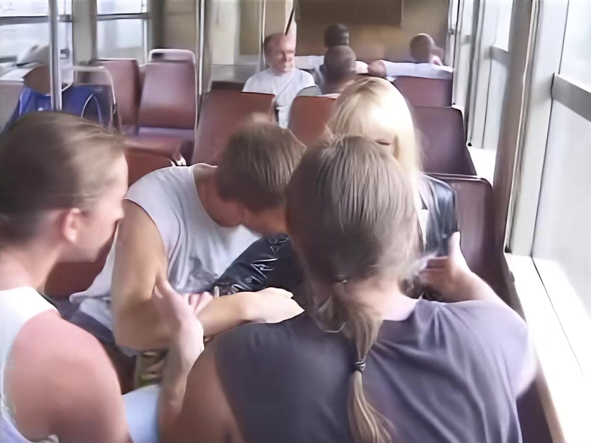Пьяная компашка парней с пивом в руках ехала на движ в центр города и тут в автобус заходит длинноногая красивая шикарная блондинка вся в коже. Ну как пропустить такую девчонку чтобы не подцепить ее. Как на счет секса прямо в автобусе? Да не проблема! Парни дерут девушку втроем во все дыры и кончают на красивое лицо. День удался у всех!